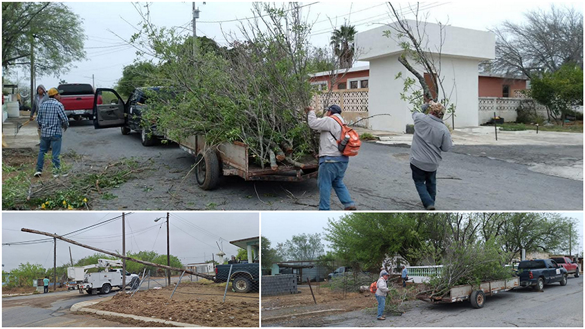 Por instrucciones de la Mtra. Laura Peña, desde temprana hora el personal de Servicios Primarios y Obras Públicas realizó recorridos por distintos puntos del municipio, atendiendo reportes y trabajando en la limpieza y retiro de daños.