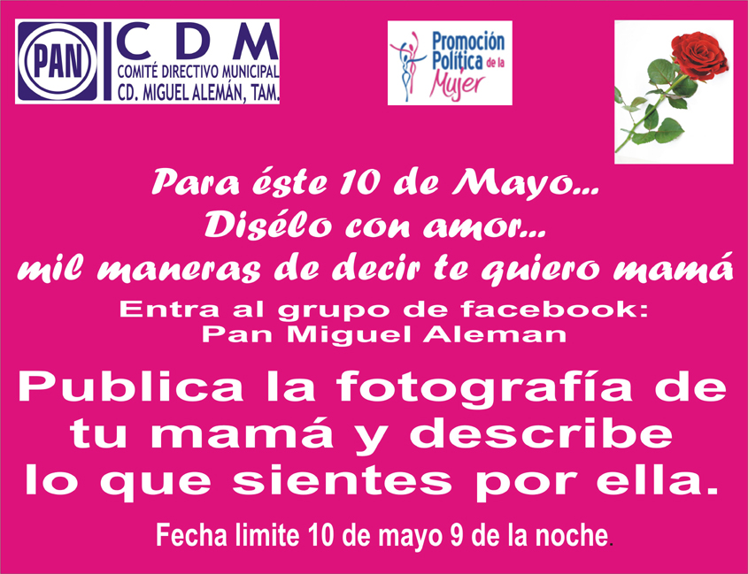 Con la finalidad de seguir impulsando y fomentando los buenos principios y valores entre las familias, el Presidente del Comité Directivo del PAN de Miguel Alemán el Dr. H. Osvaldo Sáenz Cantú presentó un nuevo concurso en las redes sociales donde los usuarios podrán entrar solamente en el Facebook del GRUPO PAN MIGUEL ALEMAN y publicar una fotografía de su madre y escribirle una felicitación, un pequeño pensamiento, una poesía o lo que deseen decirle a la reina del hogar.
