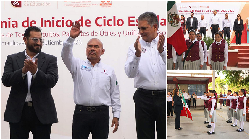 El Presidente Municipal Biol. Ramiro Cortez Barrera, acompañado del secretario de Seguridad Pública en Tamaulipas, Gral. Carlos Pancardo Escudero, encabeza la ceremonia de Inicio del Ciclo Escolar 2025-2026 en la Escuela Secundaria Técnica No 49 "Wilfrido Massieu".